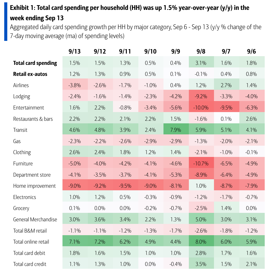 From BofA: βTotal card spending per HH was up 1.5% y/y in the week ending Sep 13, according to BAC aggregated credit & debit card data. In our sectors, y/y spending growth in entertainment saw the biggest rise since last week & airlines saw the biggest decline. After strong Aug retail sales, BAC card data on spending looks stable in Sep, in line with our call for a consumer rebound.β