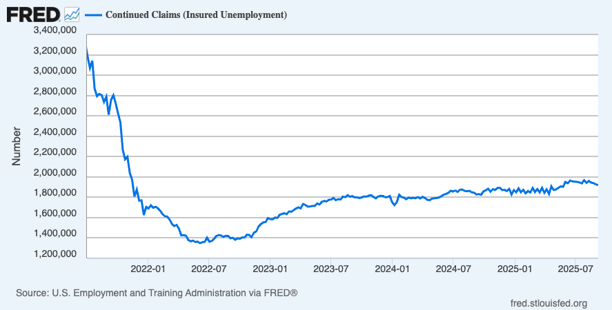 Insured unemployment, which captures those who continue to claim unemployment benefits, declined to 1.92 million during the week ending September 6. This metric is near its highest level since November 2021.