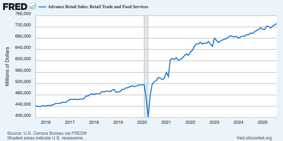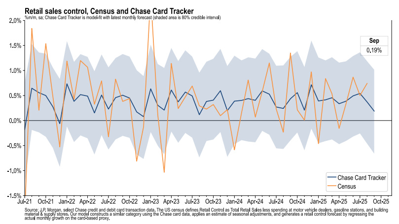 π³ Card spending data is holding up. From JPMorgan: βAs of 12 Sep 2025, our Chase Consumer Card spending data (unadjusted) was 3.4% above the same day last year. Based on the Chase Consumer Card data through 12 Sep 2025, our estimate of the US Census September control measure of retail sales m/m is 0.19%.β