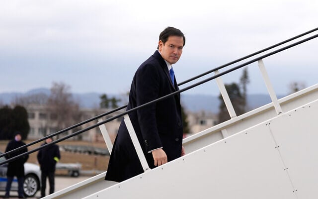 Marco Rubio boards the airplane as he departs the Bratislava Airport in Bratislava, Slovakia, February 15, 2026. (AP/Alex Brandon, Pool)