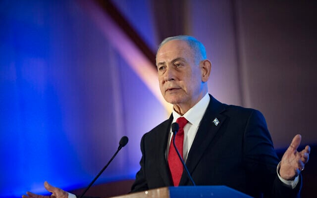 Prime Minister Benjamin Netanyahu attends the Conference of Presidents Leadership Mission to Israel in Jerusalem, February 15, 2026 (Chaim Goldberg/Flash90)