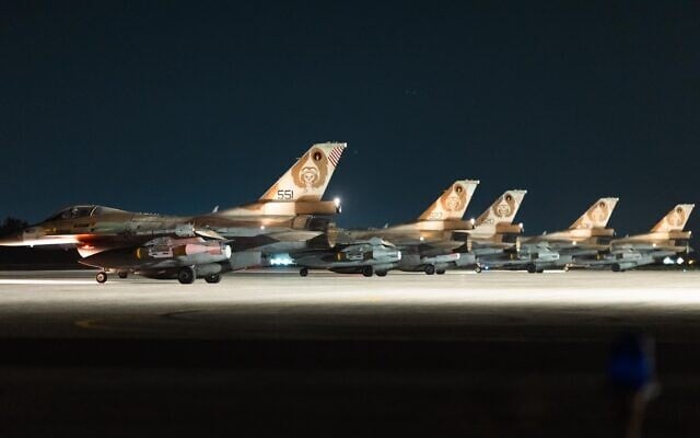 Israeli Air Force F-16 fighter jets prepare to take off for strikes in Iran, in a handout photo published on June 27, 2025. (Israel Defense Forces)