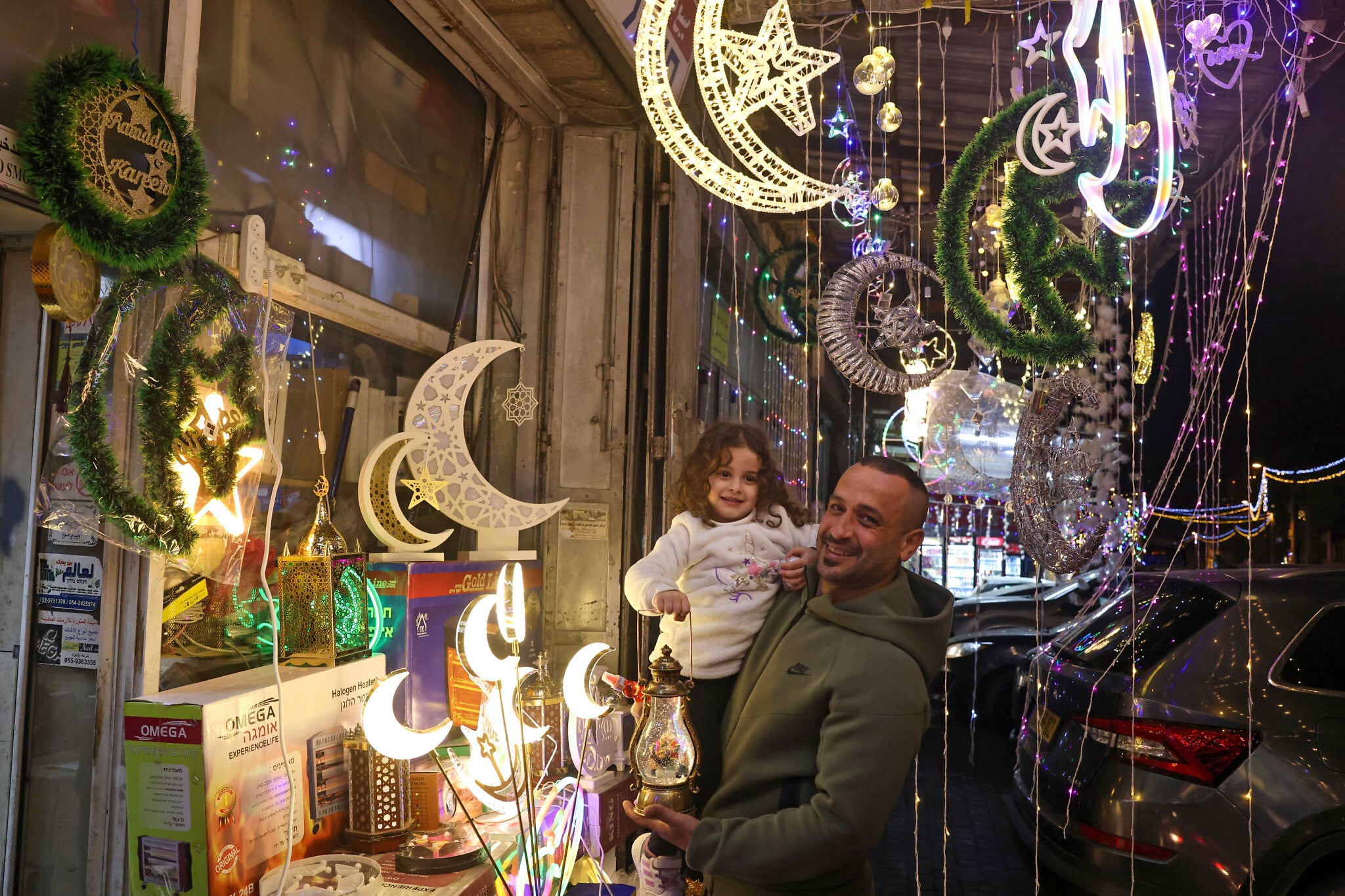 A Palestinian man holding his daughter pose for a picture as they shop for decorative lights at a shop in east Jerusalem on February 16, 2026, as Muslims prepare for the holy fasting month of Ramadan. (AHMAD GHARABLI / AFP)