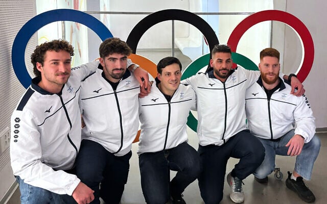 Members of Israel’s bobsleigh team, from left, Uri Zisman, Omer Katz, AJ Edelman, Ward Farwaseh and Itamar Shprinz, pose at the Olympic Committee of Israel headquarters, January 28, 2026, in Tel Aviv, before they depart for the 2026 Winter Olympics. (AP/Julia Frankel)