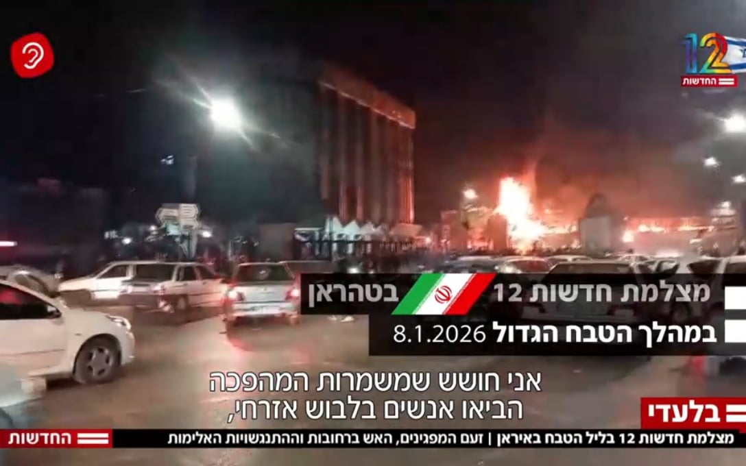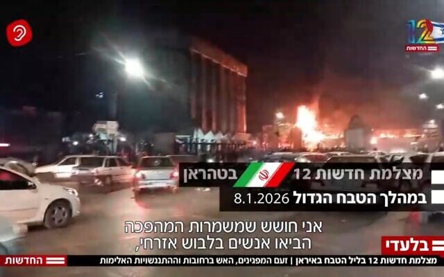 Screenshot from footage broadcast February 15, 2026, of protests in Iran on January 8, 2026. (Channel 12 screenshot)