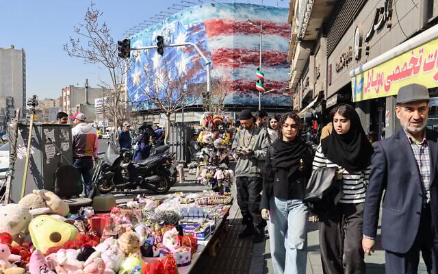 Iranians walk past a street vendor’s stand with an anti-US billboard visible in the background on Enqelab Square in Tehran on February 17, 2026. (ATTA KENARE / AFP)
