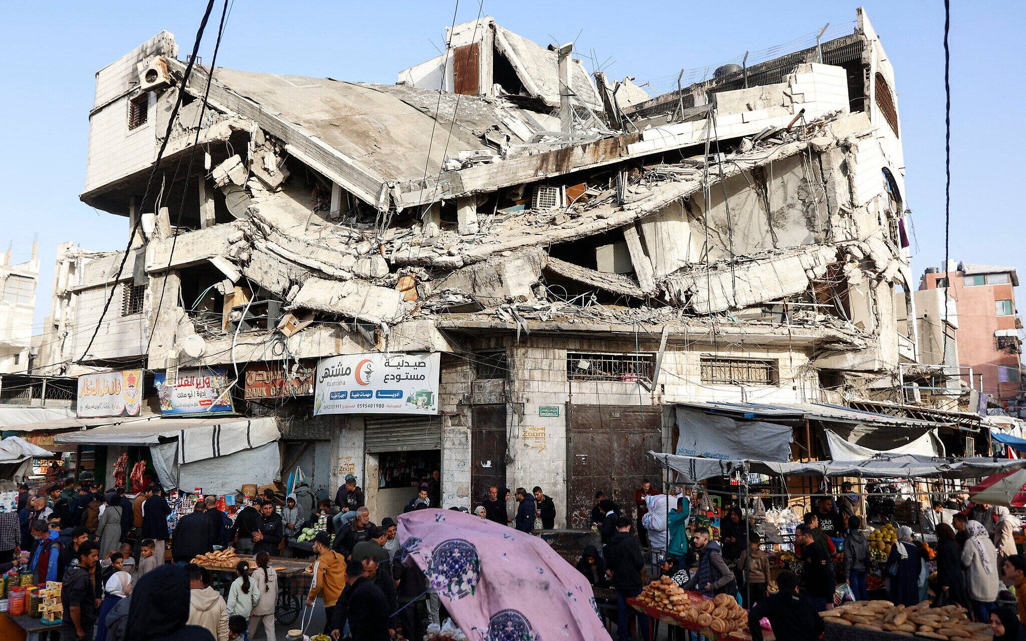 Palestinians shop for food beneath a destroyed building in Gaza City’s Zawiya market on February 18, 2026, on the first days of the holy fasting month of Ramadan. (Omar AL-QATTAA / AFP)
