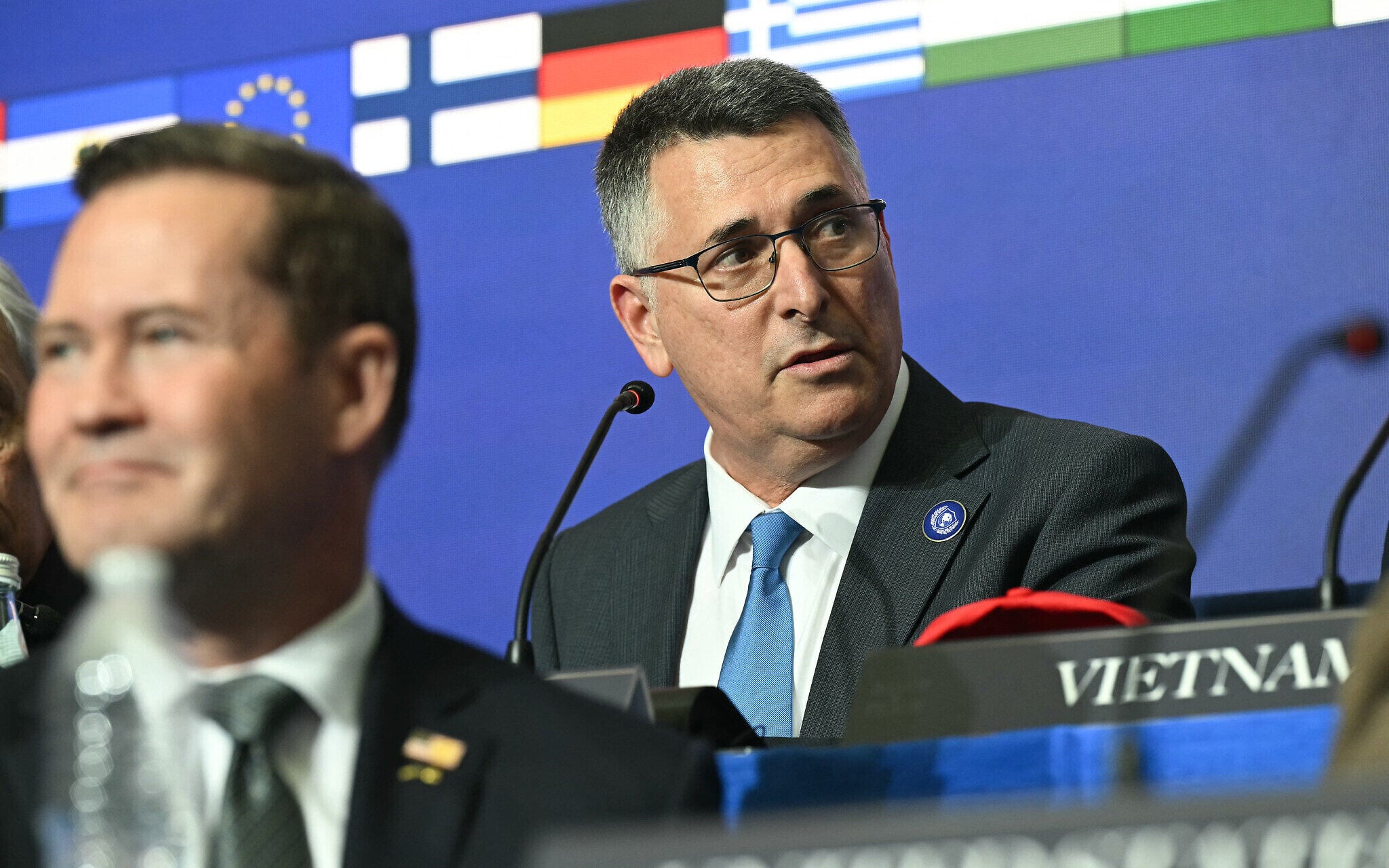 The gathering contained many of the features of a Trump political rally, from the music to the red MAGA-style “USA” hats that were placed at the seats of the senior representatives from nearly 50 countries.