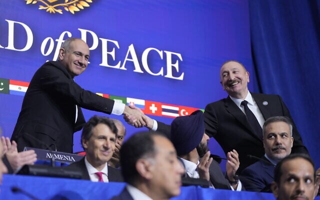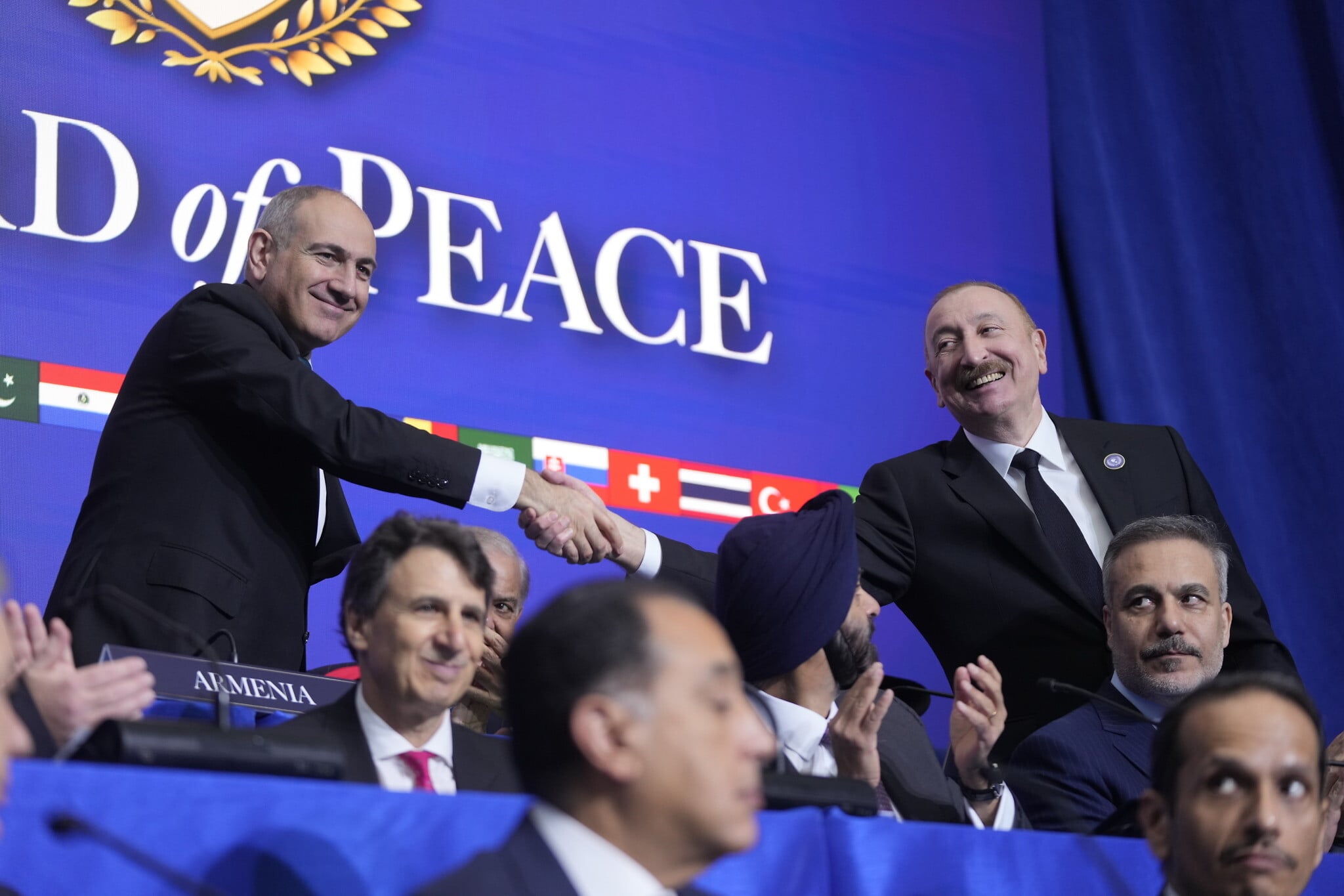 Armenia’s Prime Minister Nikol Pashinyan, left, and President of Azerbaijan, Ilham Aliyev, right, shake hands during a Board of Peace meeting at the U.S. Institute of Peace, Thursday, Feb. 19, 2026, in Washington. (AP Photo/Mark Schiefelbein)