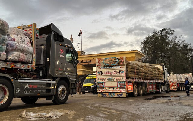Humanitarian aid trucks enter through the Egyptian side of the Rafah border crossing with the Gaza Strip on February 4, 2026, days after Israel permitted a limited reopening of the border post. (AFP)