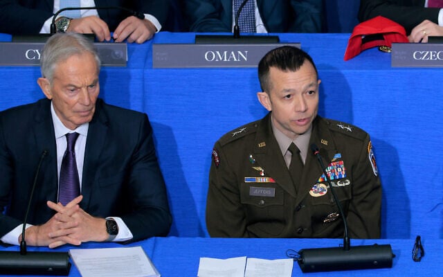 ISF Commander Major General Jasper Jeffers (R) speaks as former UK prime minister Tony Blair listens during the inaugural meeting of the Board of Peace at the Donald J. Trump Institute of Peace on February 19, 2026, in Washington, DC. (Chip Somodevilla/Getty Images/AFP)