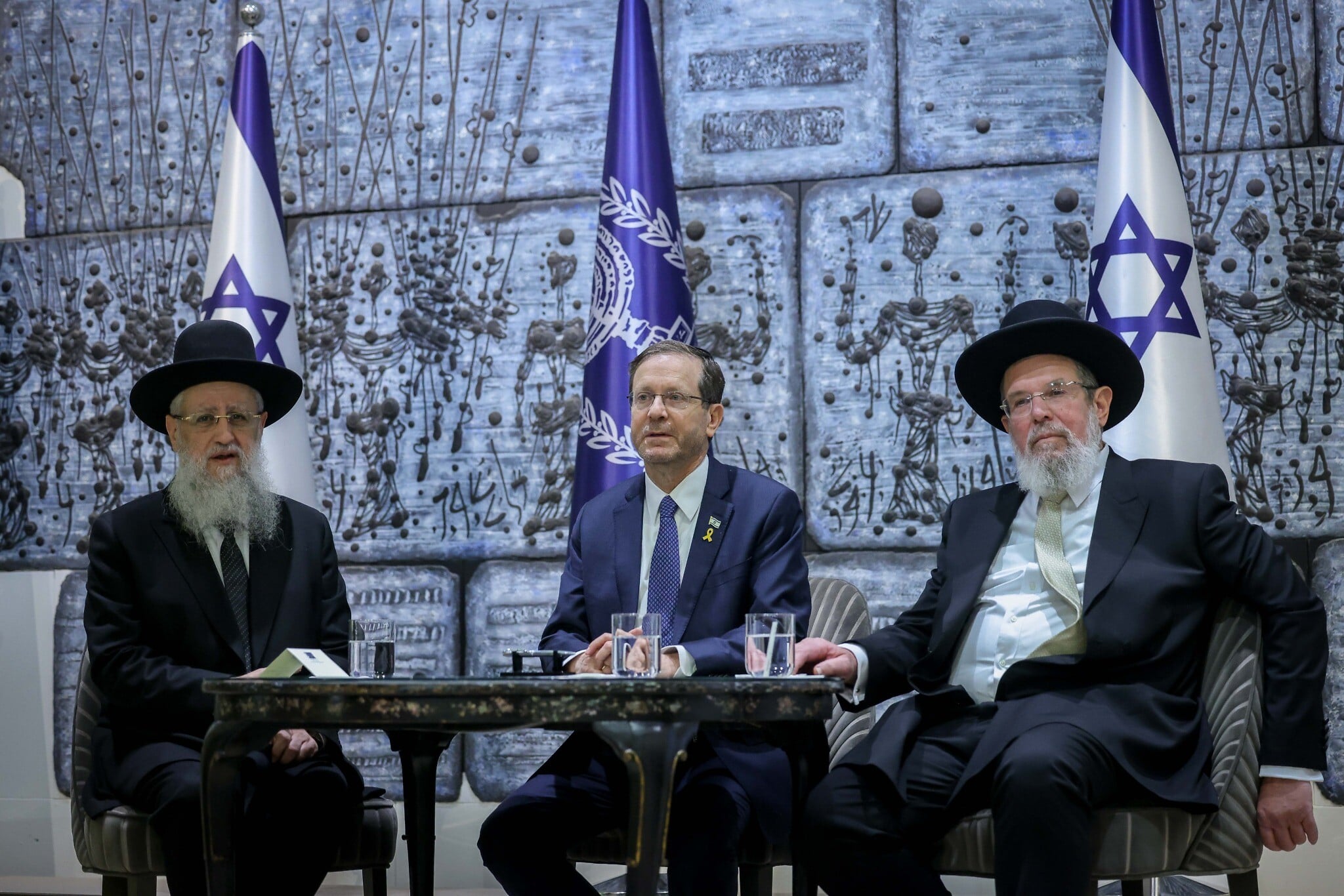 Sephardic Chief Rabbi David Yosef (right) and Ashkenazi Chief Rabbi Kalman Ber (left), with Israel’s President Isaac Herzog during their swearing-in ceremony at the President Residence in Jerusalem, on November 4, 2024. (Chaim Goldberg/Flash90)