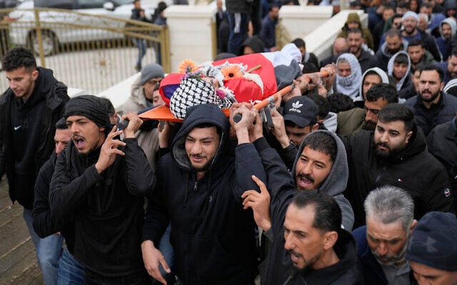 Footage from Abu Siam’s funeral in Mukhmas on Thursday showed people waving Palestinian flags and chanting religious and populist slogans as they carried his body, which was wrapped in a Palestinian flag and a keffiyeh.
