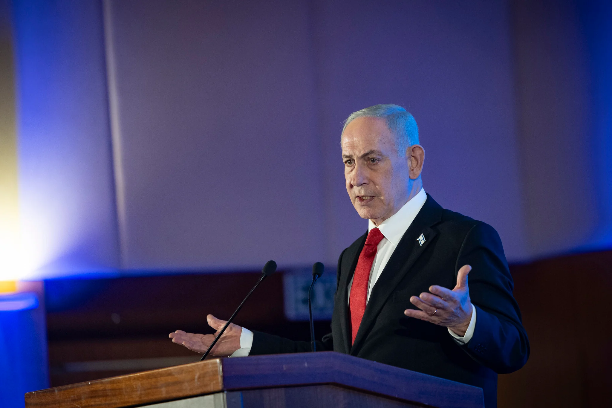 Prime Minister Benjamin Netanyahu attends a Conference of Presidents of Major American Jewish Organizations in Jerusalem, on February 15, 2026. (Chaim Goldberg/Flash90)