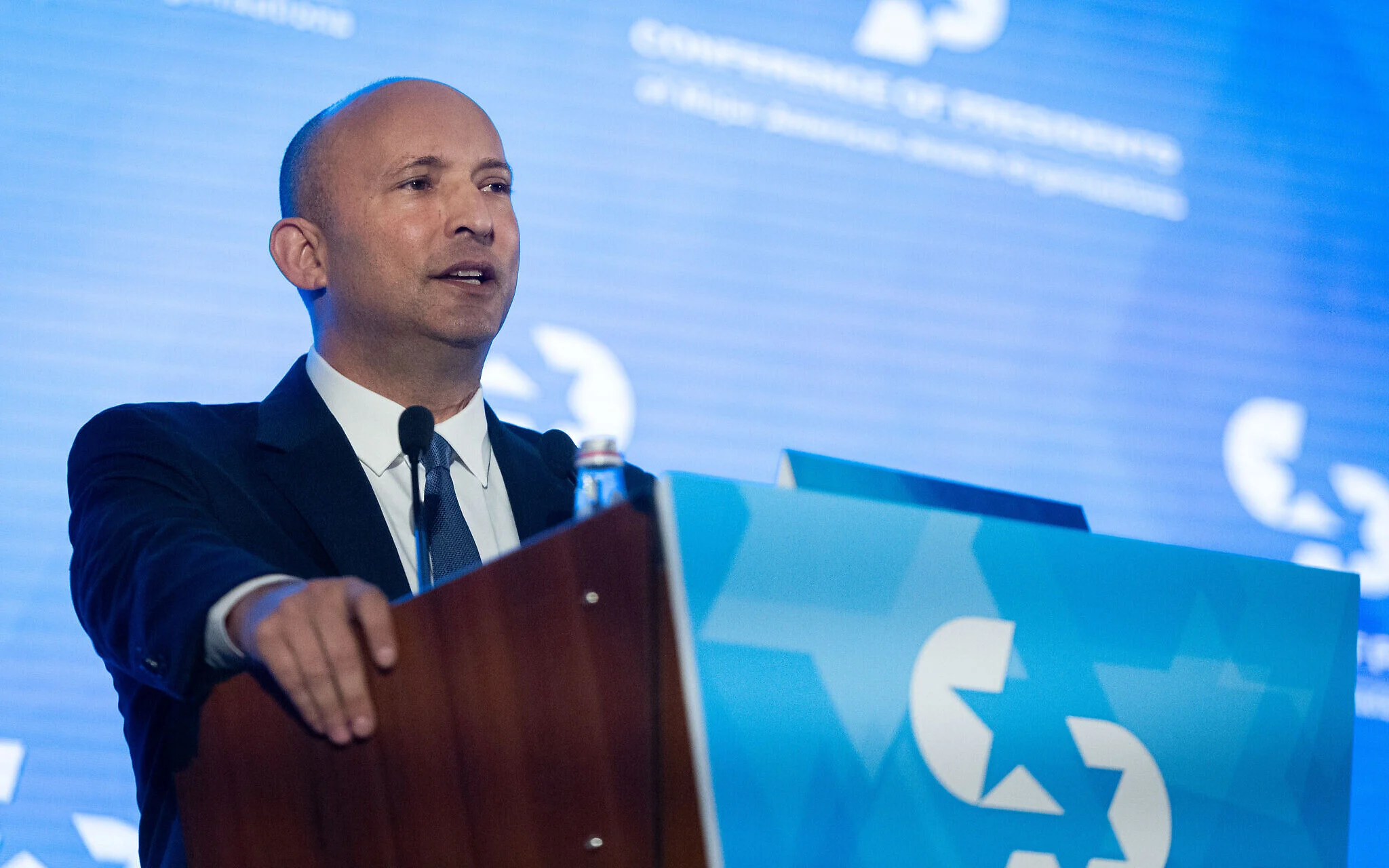 Former prime minister Naftali Bennett speaks at the Conference of Presidents of Major American Jewish Organizations in Jerusalem, on February 17, 2026. (Yonatan Sindel/Flash90)