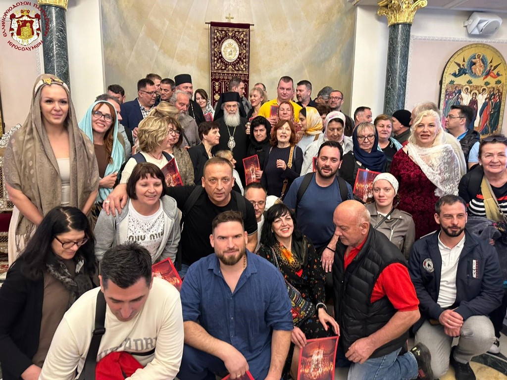 Subsequently, His Beatitude received a large group of pilgrims from Greece, Serbia, and Romania. He blessed them and addressed them on the spiritual meaning of pilgrimage, as well as on the crucifying and resurrectional significance of the City of Jerusalem, which welcomed upon its soil our Crucified and Risen Lord Jesus Christ. He noted that Jerusalem constitutes the embodiment of the mystery of the Incarnation and the guarantee of the unity of the Churches.