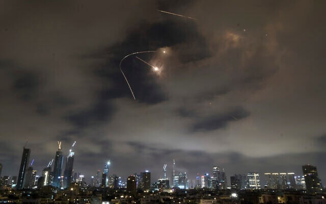 Israeli air defenses fire intercept missiles during an Iranian attack over Tel Aviv, early June 21, 2025. (AP Photo/ Leo Correa)