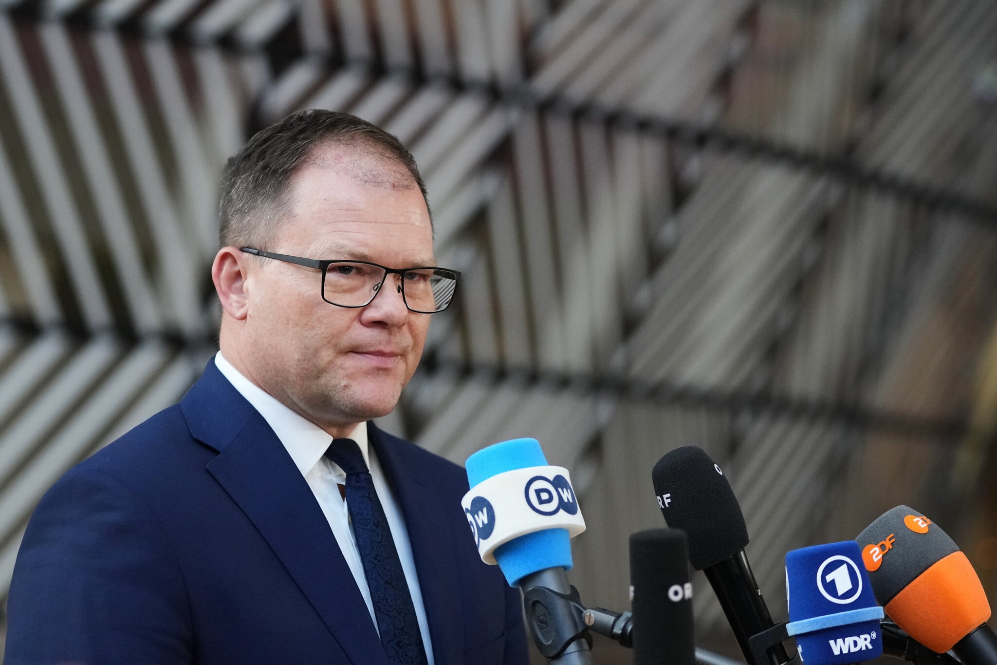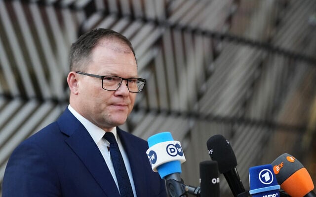 Germany’s Environment Minister Carsten Schneider speaks with the media as he arrives for a meeting of EU environment ministers at the European Council building in Brussels, Belgium, November 4, 2025. (Virginia Mayo/ AP)