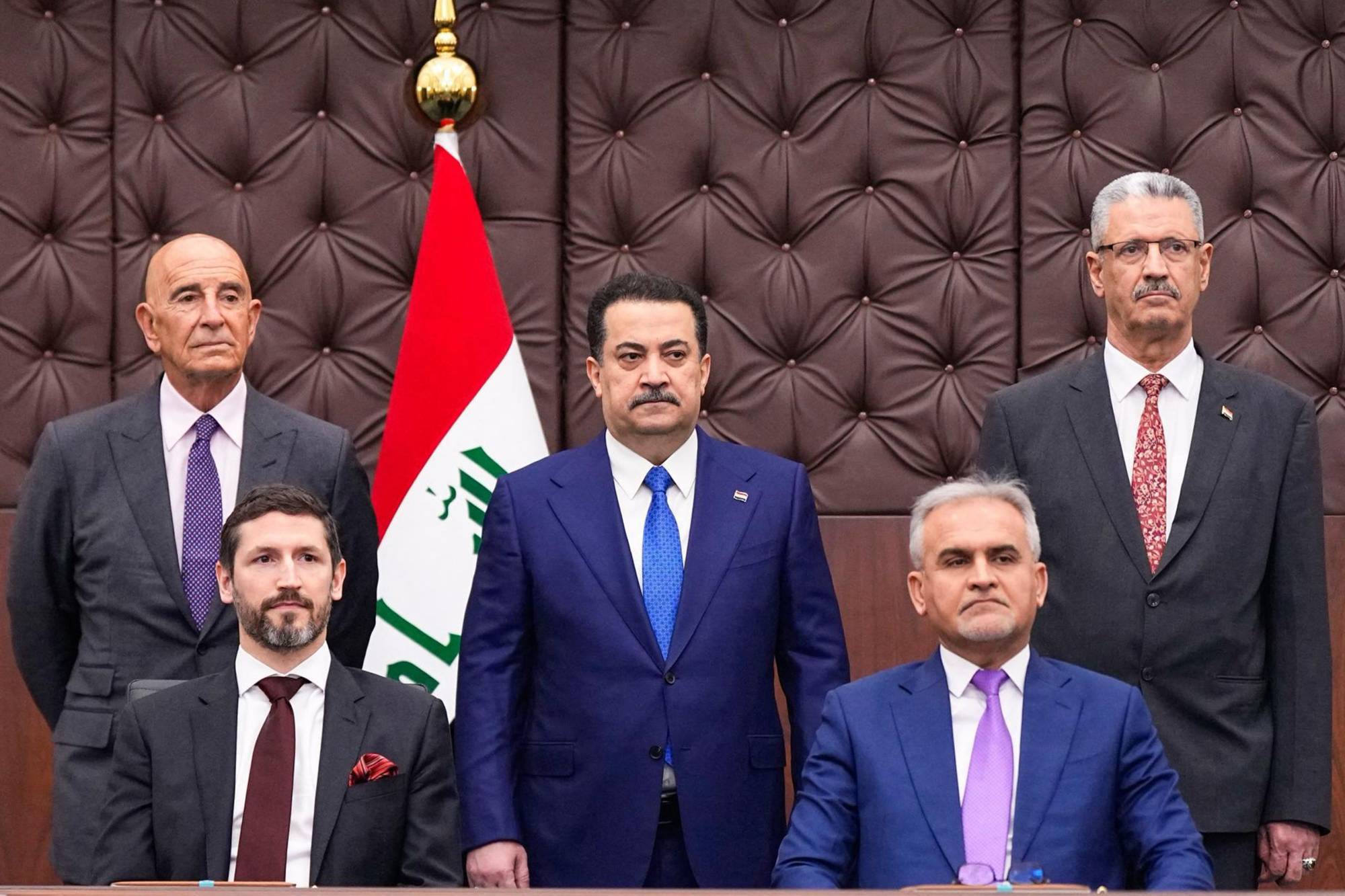 This handout picture made available by the Iraqi prime minister’s office shows Iraq’s Prime Minister Mohammed Shia al-Sudani (top C), Oil Minister Hayan Abdul Ghani al-Sawad (top R), US envoy Tom Barrack (top L), Chevron’s Director of Business Development Joe Koch (bottom L), and the Basra Oil Company Director Bassem Abdul Karim (bottom R) attending the signing of agreements between Chevron Corporation and the Basra Oil Company at the government palace in Baghdad on February 23, 2026. (Iraqi Prime Minister’s Press Office / AFP)