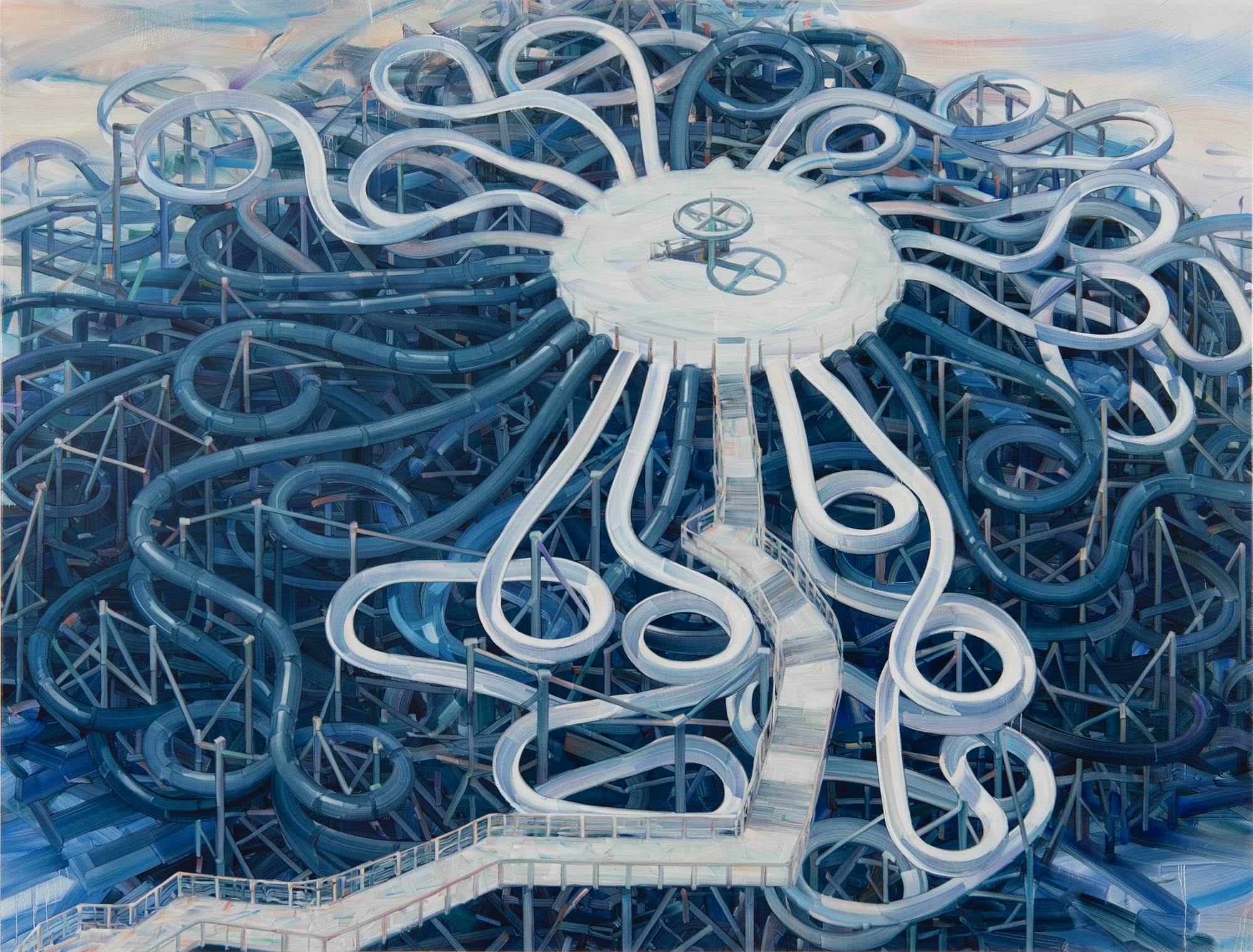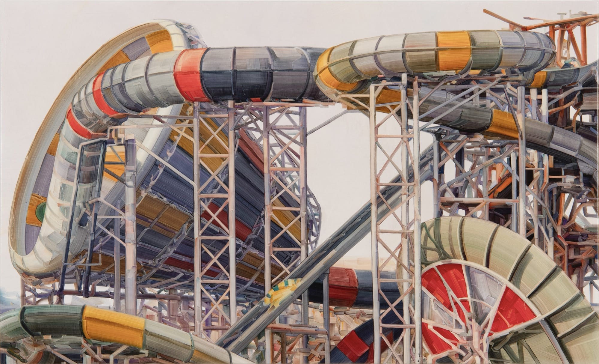 Considering Alex Hutton’s fascination with rollercoasters and monumental waterslides, he doesn’t actually ever climb aboard. “Heights and the sinking feeling during free-fall bother me too much to enjoy them,” he tells Colossal. In a way, that adds even further dimension to the enigmatic, unpeopled atmosphere of his meticulous oil paintings, which focus on rollercoasters, waterslides, and intricately contrived frameworks.