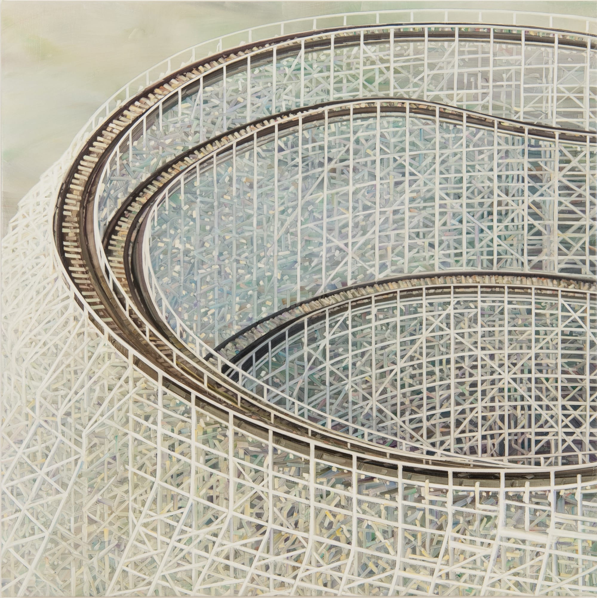 Devoid of the cars that roll along the tracks, Hutton focuses exclusively on volume, line, and three-dimensional grids, also typically setting the undulating forms against blank or brushy backgrounds so that even their scale is disorienting. While we typically associate the rides with youthful energy and nostalgia, the structures are strangely still and stark when pared down to their pure engineering.