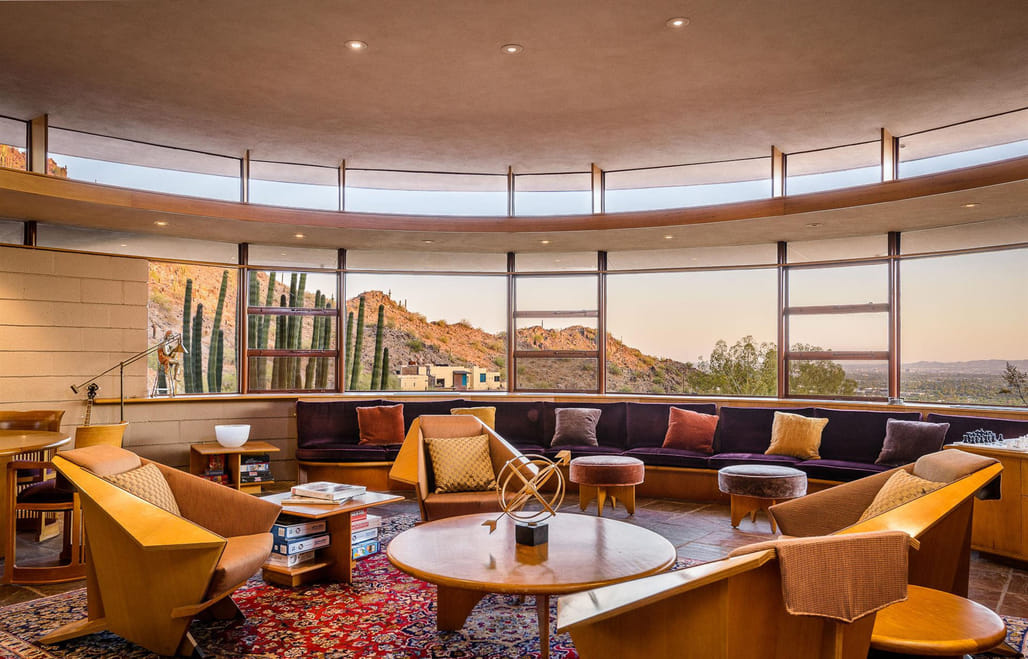 Known also as the Circular Sun House, the hilltop home was designed by Wright shortly before his death in 1959, built in 1967, and underwent a renovation in 1995. Designed to blend with the curves of the surrounding desert mountain, the layout of the home is designed as a series of overlapping concentric circles that create a flowing floor plan.