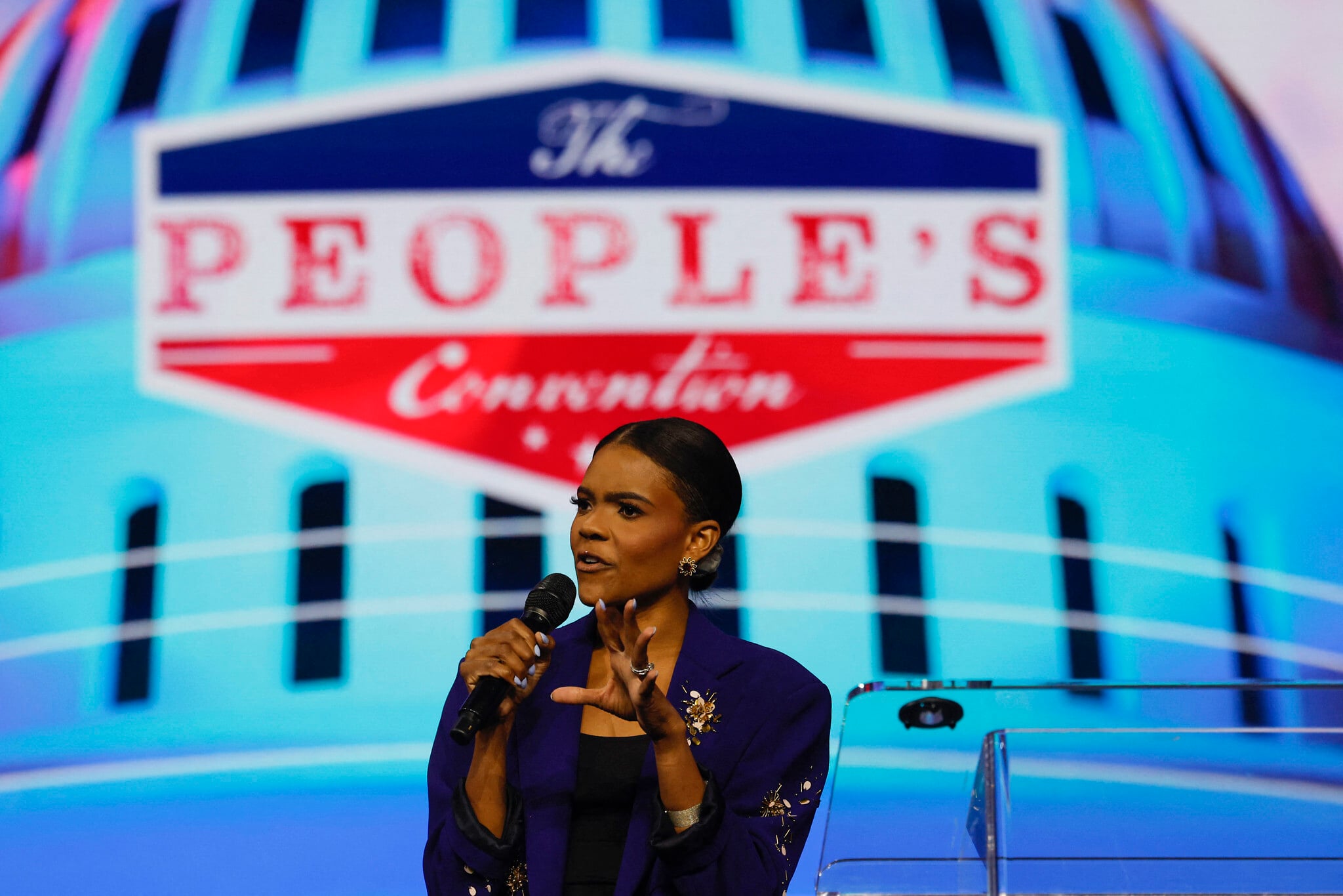 Candace Owens, US conservative political commentator, speaks on stage during ‘Turning Point’s The Peoples Convention,’ at Huntington Place in Detroit, Michigan, June 14, 2024. (Jeff Kowalsky/AFP)