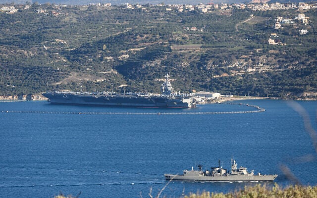 US aircraft carrier USS Gerald Ford (L) is pictured docked at Souda Bay in the Greek Mediterranean island of Crete, on February 24, 2026. (Photo by Costas METAXAKIS / AFP)