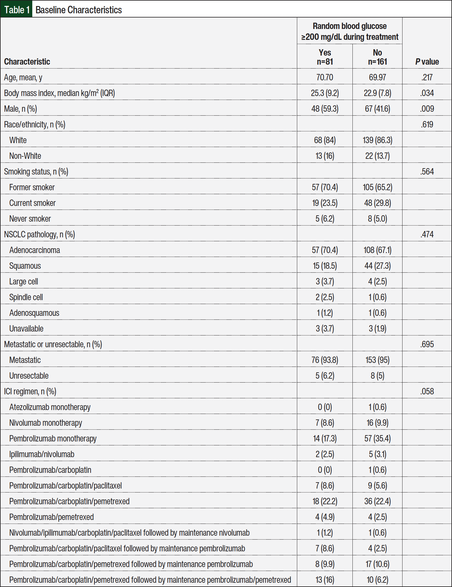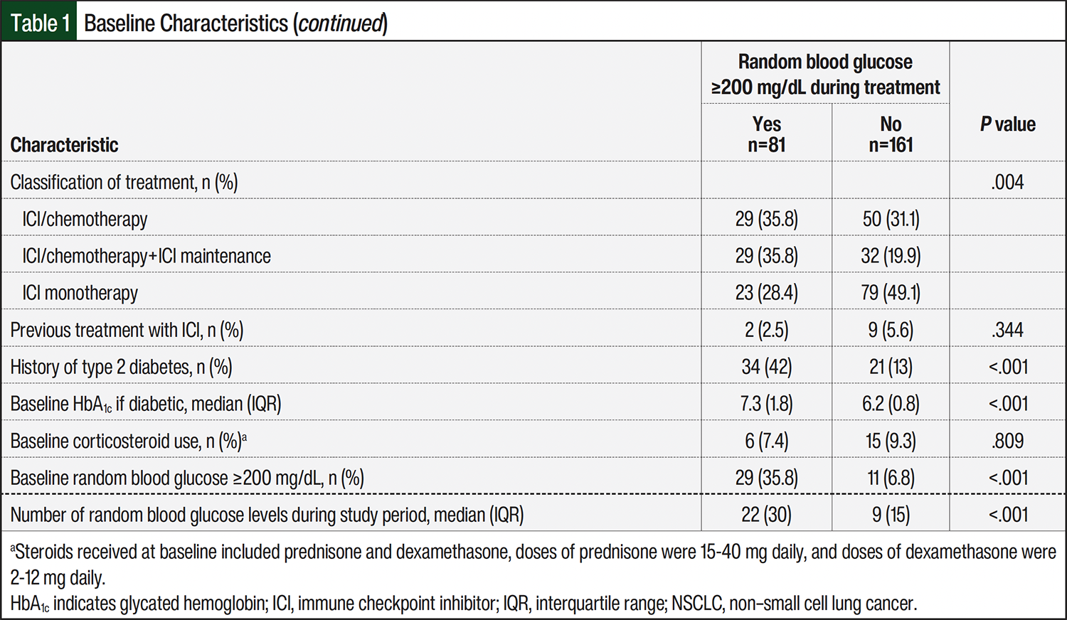 Additional risk factors for ICI-related hyperglycemia beyond corticosteroid use were also assessed in the study by Leiter and colleagues, and identifying as Hispanic or Asian, having a BMI of ≥30 kg/m2, and a history of hyperglycemia were significantly associated with hyperglycemia after starting ICI treatment.15 Race/ethnicity and obesity did not increase the risk for ICI-related hyperglycemia in our study; however, there was a limited number of non-White patients in our cohort. More studies are needed to explore the outcomes of patients with NSCLC of diverse race/ethnicity. We did find that having a history of type 2 diabetes and the occurrence of hyperglycemia before ICI treatment increased a patient’s risk for hyperglycemia while receiving ICI treatment. Screening patients for hyperglycemia and diabetes before systemic cancer treatments is recommended, especially in those with risk factors.26 Assessing patients with NSCLC for a history of type 2 diabetes and/or hyperglycemia at baseline before ICI treatment initiation can guide clinical practice and help oncology practitioners predict patients who may be at the greatest risk for ICI-related hyperglycemia and proactively include glucose monitoring during therapy to ensure this potential irAE is adequately managed. Given the median onset of ICI-related hyperglycemia of 25 days in our study, oncology practitioners should be attentive to glucose monitoring, particularly during the first few cycles of therapy.