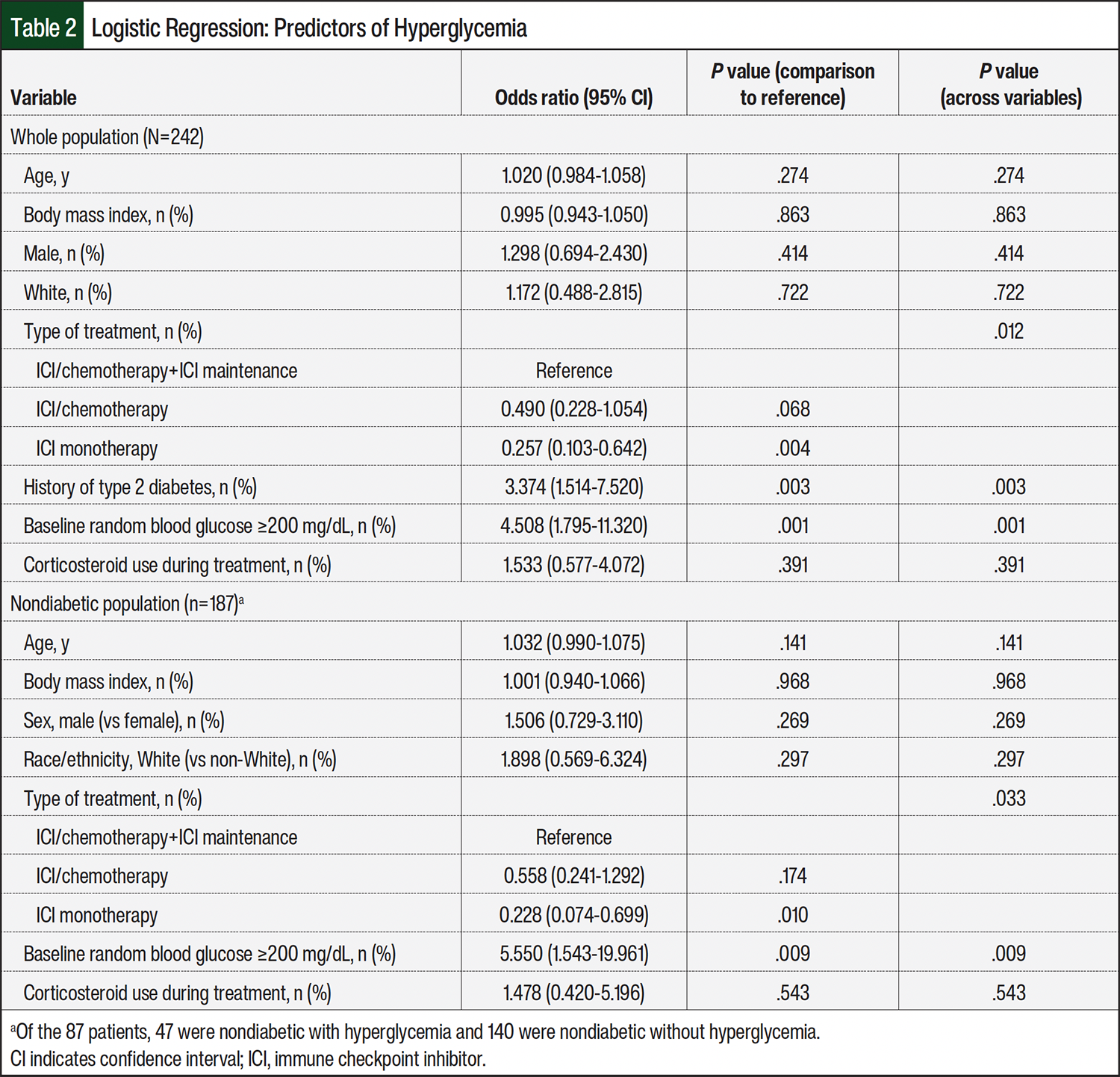 A logistic regression was completed to examine the risk factors for hyperglycemia during ICI treatment. The model was statistically significant compared with the null model; X2=56.98 (P<.001) explained 29% of the variation in outcomes (Nagelkerke R2) and correctly predicted 75.2% of cases (Table 2). The results of the logistic regression demonstrated that patients with NSCLC who received ICI monotherapy had lower odds of hyperglycemia (odds ratio [OR], 0.257; 95% confidence interval [CI], 0.10-0.64). Patients with NSCLC and a medical history of type 2 diabetes had higher odds of hyperglycemia than those without a diagnosis of type 2 diabetes (OR, 3.3; 95% CI, 1.51-7.52). Patients with NSCLC and a baseline random blood glucose of ≥200 mg/dL before ICI treatment initiation had higher odds of hyperglycemia during treatment (OR, 4.5; 95% CI, 1.79-11.3) than those with a baseline random blood glucose of <200 mg/dL.