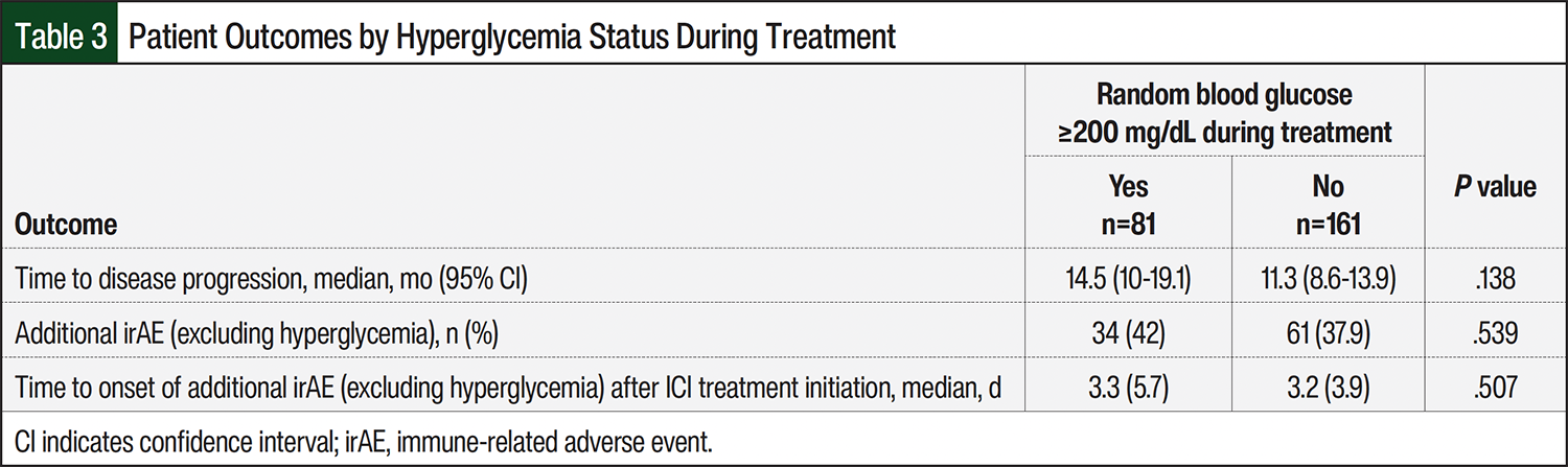 Historically, in patients with NSCLC, preexisting diabetes and/or hyperglycemia have resulted in poorer patient outcomes when receiving traditional cytotoxic chemotherapy.16-20 An analysis of the impact of baseline hyperglycemia on outcomes in patients with NSCLC receiving ICI therapy demonstrated that those in the highest quartile (median glucose, 161 mg/dL) had a significantly shorter overall survival than patients with a baseline glucose in the lowest quartile (median glucose, 91 mg/dL).21 Whether ICI-related hyperglycemia during ICI therapy portends improved or worsened patient outcomes in this particular population is unknown. Therefore, the purpose of this study was to examine the frequency of ICI-related hyperglycemia and its impact on patient outcomes among those receiving ICI treatment for metastatic or unresectable NSCLC. The findings from this study provide valuable insights, informing the clinical practice of oncology providers who manage patients with NSCLC using ICI.