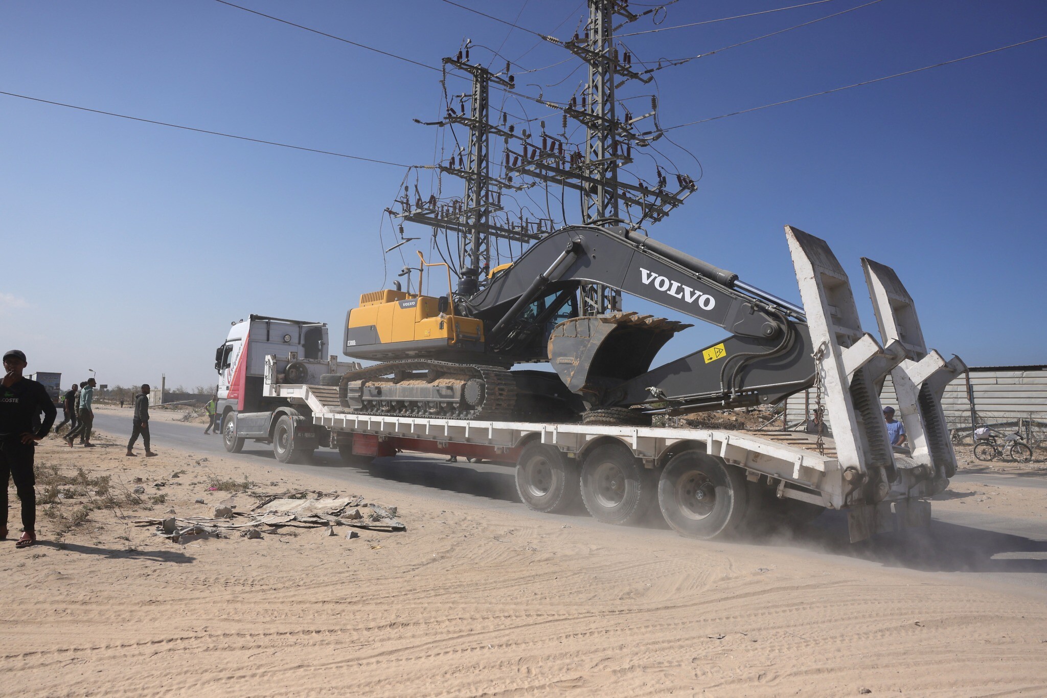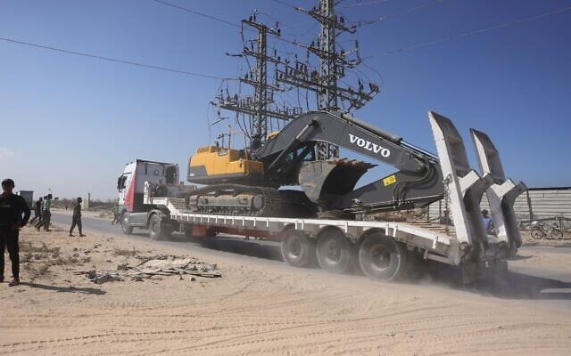 Illustrative: Heavy equipment is transported into the Gaza Strip heading to one of the sites to begin work in the recovery of the bodies of Israeli hostages Deir Al-Balah, in the central Gaza Strip on October 27, 2025. (BASHAR TALEB / AFP)