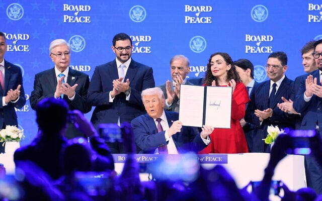 US President Donald Trump holds the charter during a signing ceremony on his Board of Peace initiative at the Annual Meeting of the World Economic Forum in Davos, Switzerland, on January 22, 2026. (AP/Markus Schreiber)