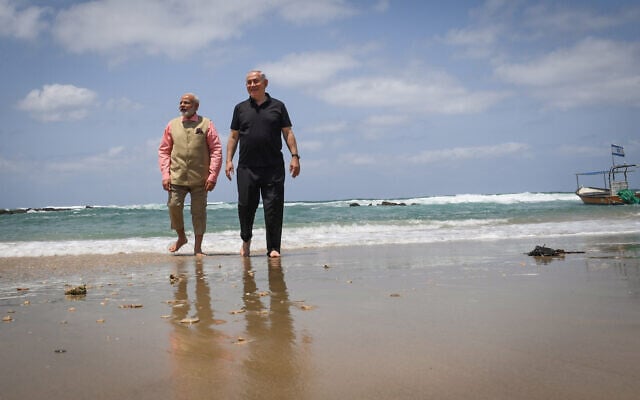 Modi became the first Indian leader to visit Israel in 2017. During that trip, he and Netanyahu waded barefoot together into the Mediterranean surf, the waves gently lapping at the hems of their pants as they talked. The two then sipped drinks and took a drive in a water desalination dune buggy.