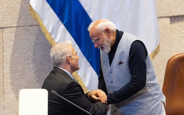 Reentering the Knesset after Netanyahu’s speech, Opposition Leader Yair Lapid shook Modi’s hand and welcomed him to the Knesset.
