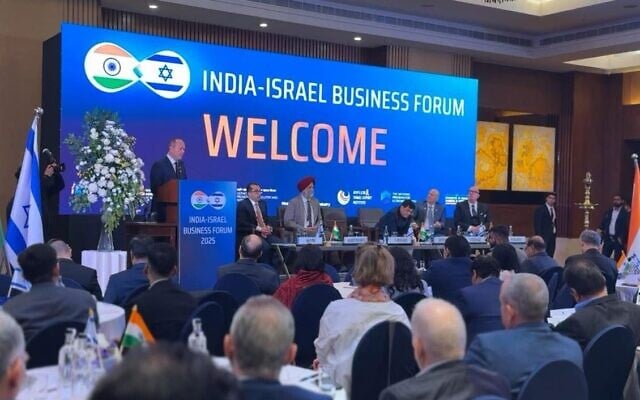 Israel’s Economy Minister Nir Barkat speaks at the India-Israel business forum in New Delhi, February 2025. (Courtesy of Israel Economy Ministry)