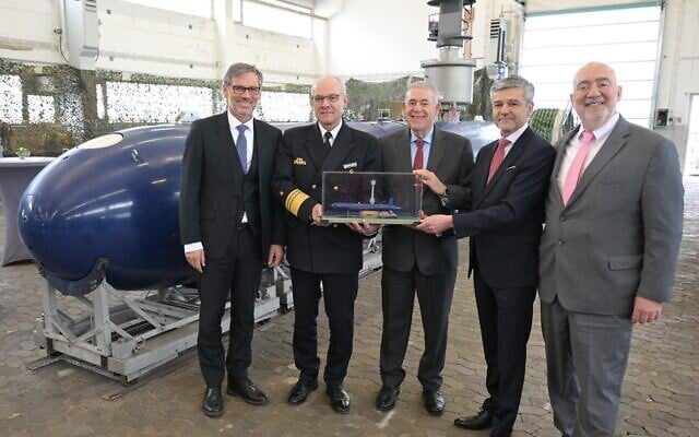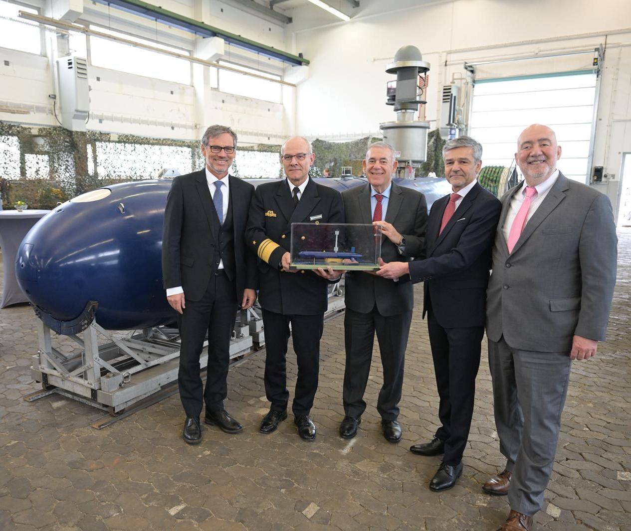(R-L): Ambassador Ron Prosor, Israel’s Ambassador to Germany; Michael Ozegowski, EVP of TKMS ATLAS ELEKTRONIK; Boaz Levy, President & CEO of IAI; Vice Adm. Jan Christian Kaack, chief of the German Navy; and Jens Plötner, State Secretary at the Federal Ministry of Defence, during the handover of a BlueWhale large autonomous underwater vehicle (AUV) to the German Navy at Eckernförde naval base in Germany, February 25, 2026. (Israel Aerospace Industries)