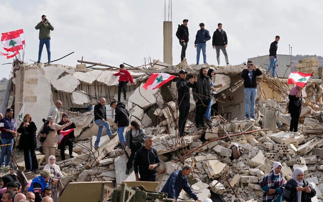 People gather as Lebanese Prime Minister Nawaf Salam tours areas in southern Lebanon along the border with Israel that the Lebanese army says it has been cleared of the armed presence of the Hezbollah terror group, in the village of Yarine, Saturday, Feb. 7, 2026. (AP Photo/Mohammed Zaatari)