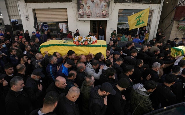 Mourners carry the coffins of three Hezbollah fighters killed in Israeli strikes during their funeral procession in the village of Nabi Sheet in eastern Lebanon, February 21, 2026. (AP Photo/Bilal Hussein)