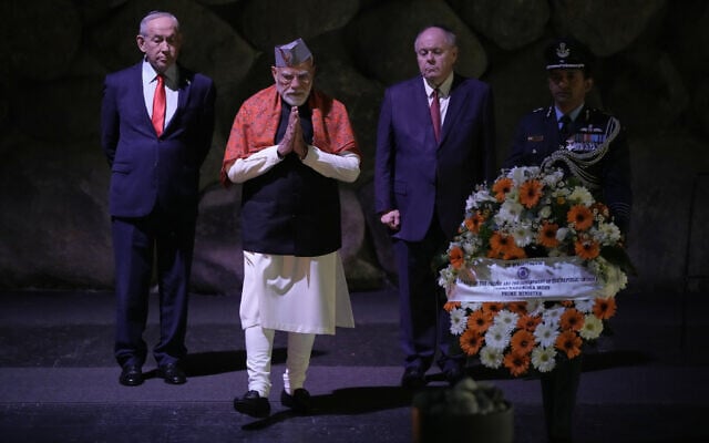 According to the Prime Minister’s Office, Netanyahu showed Modi the names of Holocaust victims from the family of his wife, Sara, after which Modi laid a wreath in Yad Vashem’s Hall of Remembrance.