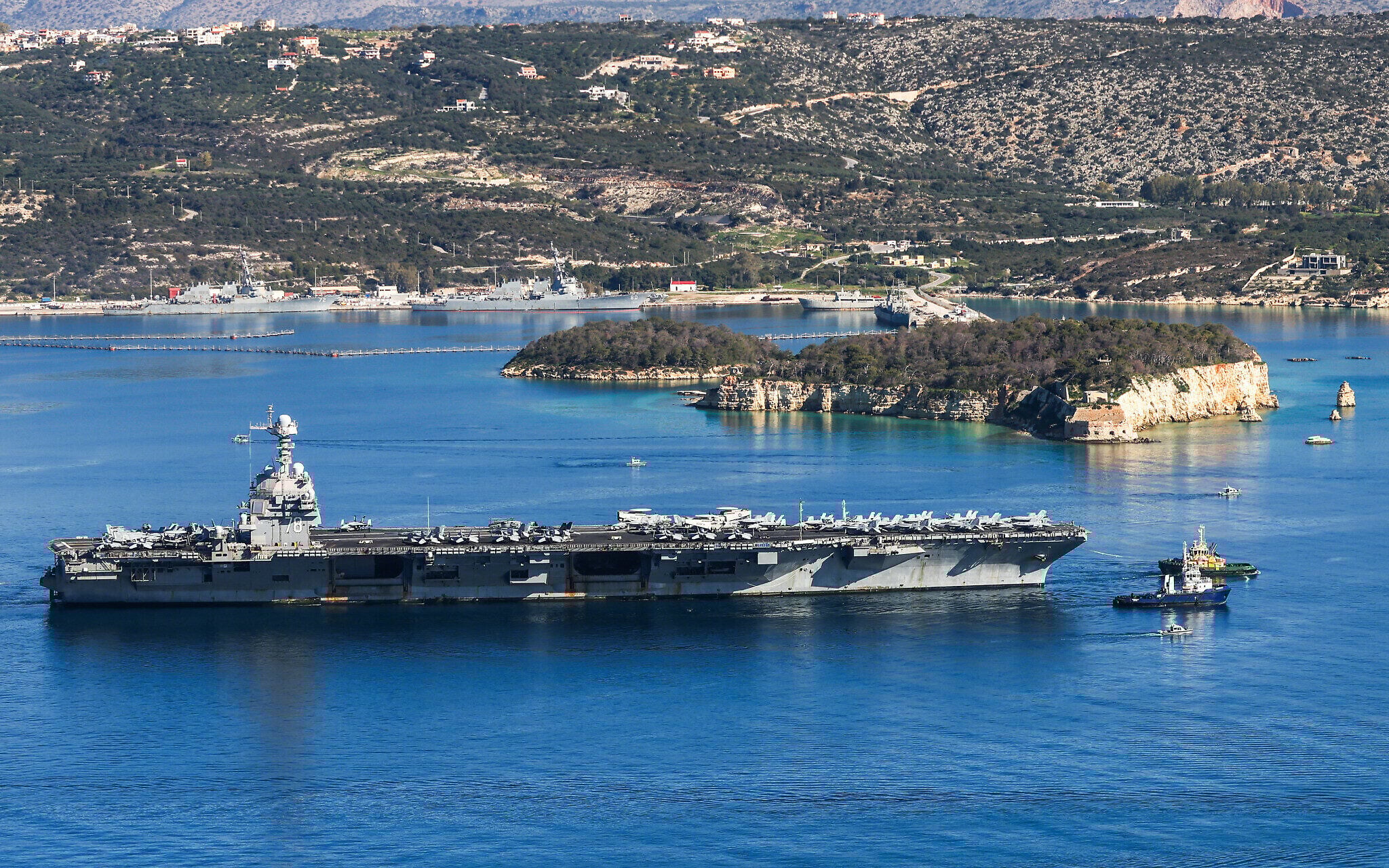 The US Navy aircraft carrier USS Gerald R. Ford, dispatched to the region amid tensions with Iran, departs Souda Bay on the Greek island of Crete on February 26, 2026. (Costas METAXAKIS / AFP)