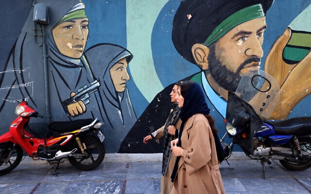 Iranian women walk past a mural depicting Iranian revolutionary female soldiers in Tehran on February 25, 2026. (Photo by ATTA KENARE / AFP)