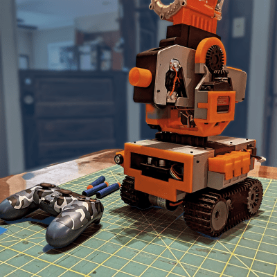 [Joshua Clay] recently unveiled his newest RC Nerf Dart Robot and talks through his design choices, pointing out that in his aim to have it launch darts fast and hard he may have somewhat overshot the mark. He found out first hand during testing that it shoots hard enough to leave welts through a sweatshirt and probably should be downgraded a bit. Thankfully, one of the features of his new unit is a highly modular design that makes iterating easier than ever.