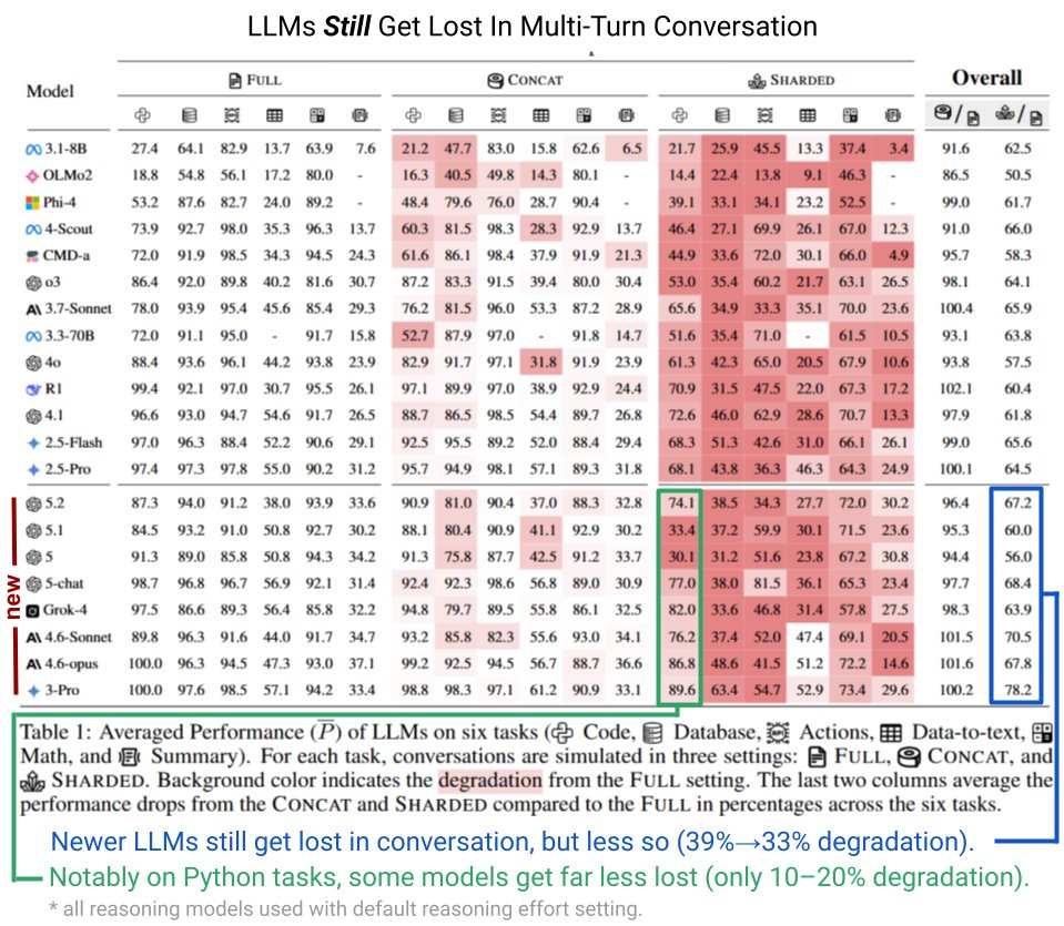 The latest generation of large language models—from GPT-5 onward—still struggles when tasks are spread across multiple conversation turns. Researcher Philippe Laban and his team tested current models on six tasks covering code, databases, actions, data-to-text, math, and summarization. Performance drops significantly when information is split across several messages (sharded) instead of a single prompt (concat).