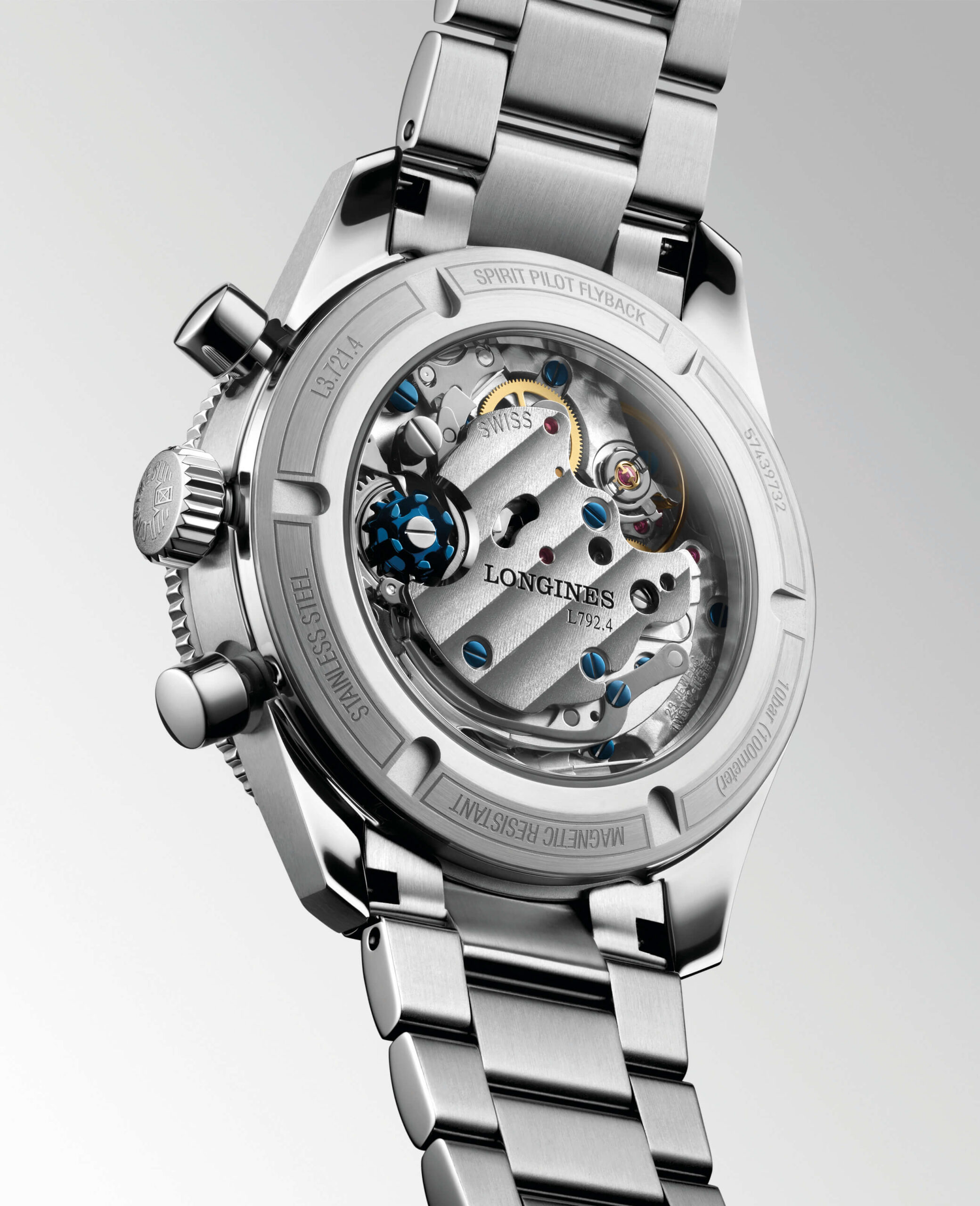 The engine that drives the Spirit Pilot Flyback is the COSC chronometer certified manual winding Longines calibre L792.4, which owes its precision timing capabilities to its column-wheel chronograph mechanism with flyback function, and its magnetic resistance to the silicon balance spring. A power reserve of 68 hours and water-resistance of 100 metres ensure that the watch keeps functioning under nearly all conditions. A see-through screw-down caseback and a stainless-steel bracelet or brown leather strap — interchangeable options, both with a microadjustment folding clasp — complete the timepiece.