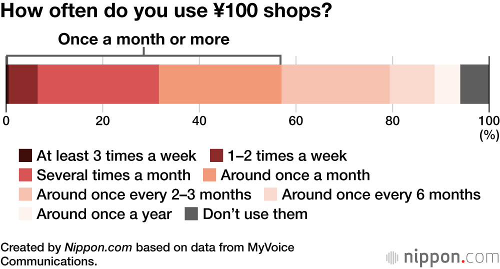 According to a survey conducted by the online research company MyVoice Communications, looking at how often people used ¥100 shops, colloquially referred to as hyakkin (from hyakuen kin’itsu, “uniform ¥100 pricing”), the majority of respondents, at 25.4%, used them “around once a month” and a further 25.1% visited “several times a month.” When those who went “three or more times a week” and “one to two times a week” were included, the rate of monthly use rose to 57.0%. More than 50% of men visited the shops; however, women were the more frequent users with over 60%.