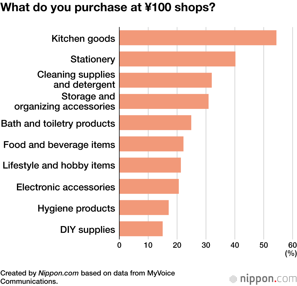 A survey in Japan found that more than half of people use reasonably priced ¥100 shops at least once a month, with kitchen goods the most popular purchases.