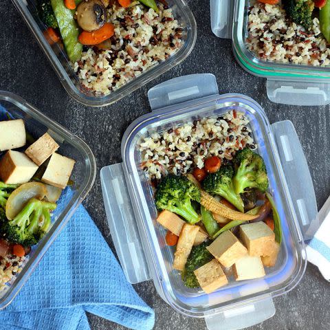 With a handful of shortcut ingredients from your grocery store, including precooked rice packets and seasoned baked tofu, you can prepare several high-fiber, high-protein meals in about 15 minutes.