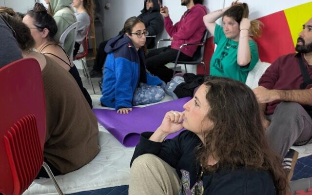 Steph Graber, at front, sits in a public shelter in Jaffa, Israel, March 1, 2026. (Deborah Danan/JTA)