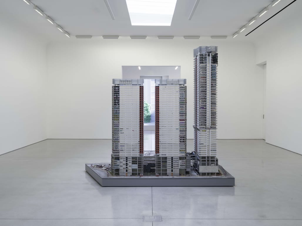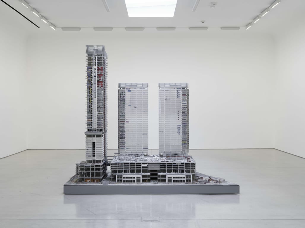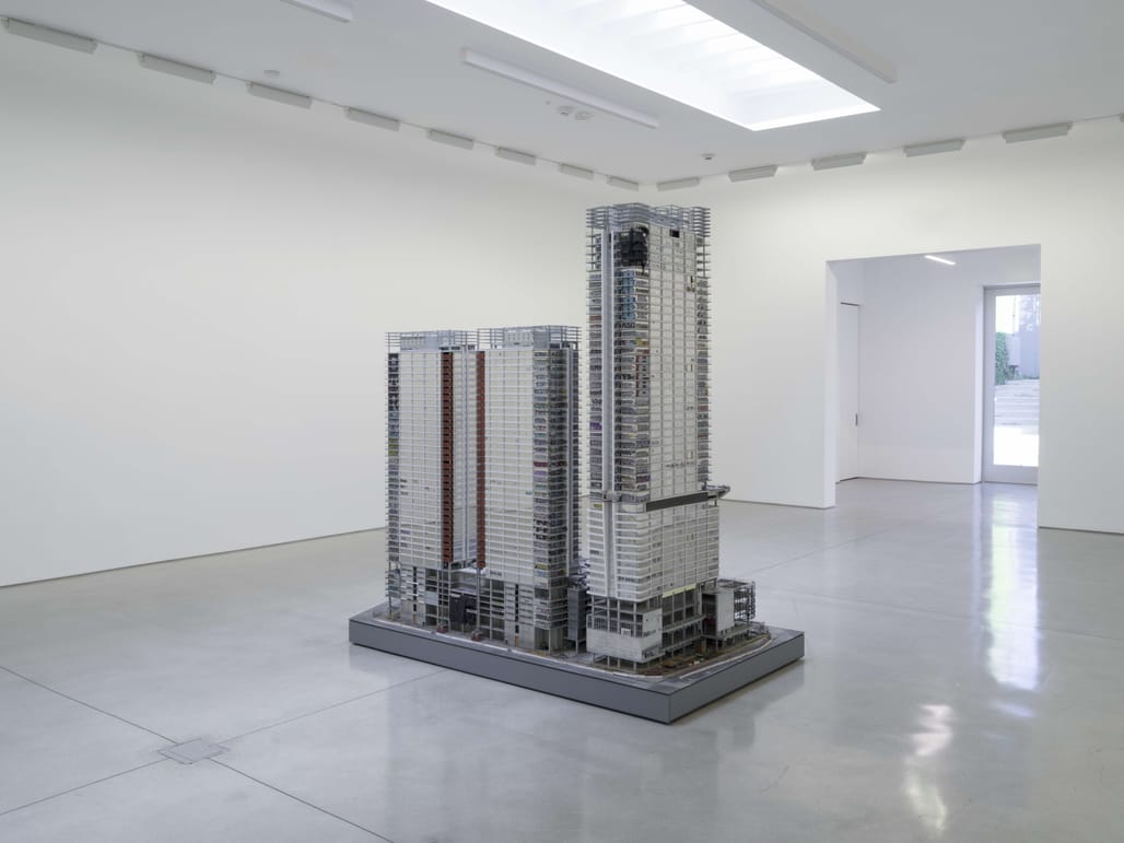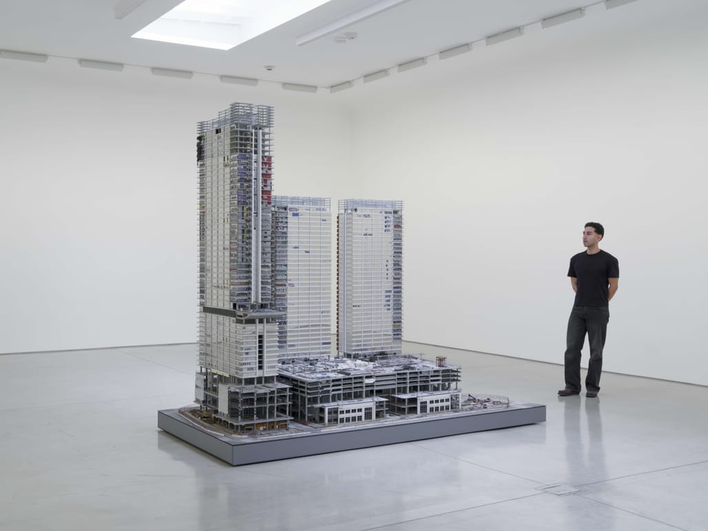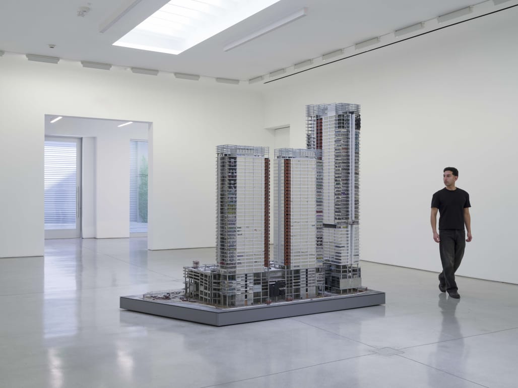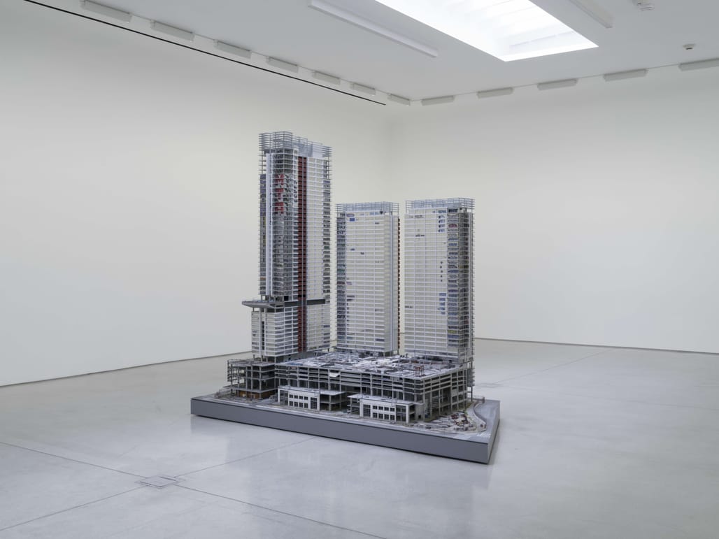 Gomez’s 9-foot hyperrealistic scale model of the megadevelopment is his most ambitious and complex sculpture to date, examining how a single building complex can represent the failures of capitalism, government, and speculative real estate. The three CallisonRTKL-designed towers were abandoned — nearly completed but still unfinished — in 2019 after Chinese investors Oceanwide Holdings Co. ran out of money for the scheme.